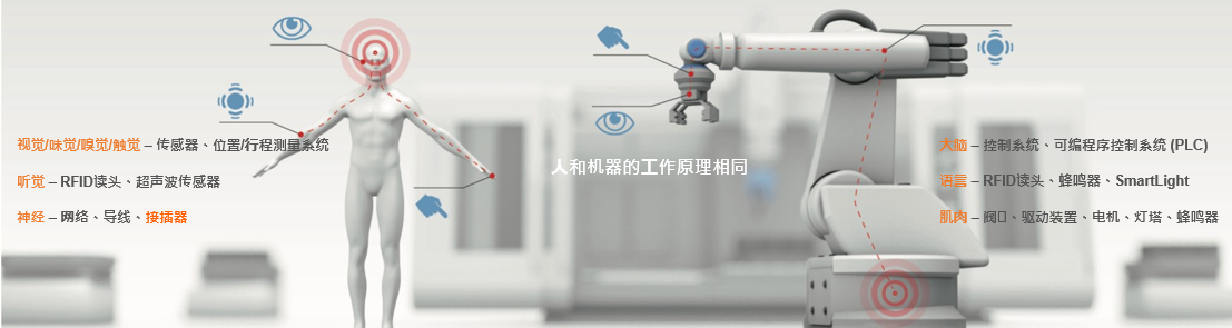 機(jī)器工作起來(簡(jiǎn)單地說)象人一樣。如同我們?nèi)祟愅ㄟ^各個(gè)感覺器官感知我們的周圍世界,機(jī)器通過不同的傳感器、設(shè)備和位移測(cè)量系統(tǒng)探測(cè)其周圍環(huán)境。機(jī)器持續(xù)接收信號(hào),將其通過網(wǎng)絡(luò)發(fā)送至控制系統(tǒng)。控制系統(tǒng)將這些信號(hào)解釋成輸入信號(hào),將其作為輸出信號(hào)發(fā)送至執(zhí)行器。例如發(fā)送至閥門、驅(qū)動(dòng)裝置或燈塔,它們會(huì)觸發(fā)一個(gè)動(dòng)作,使機(jī)器運(yùn)動(dòng)。